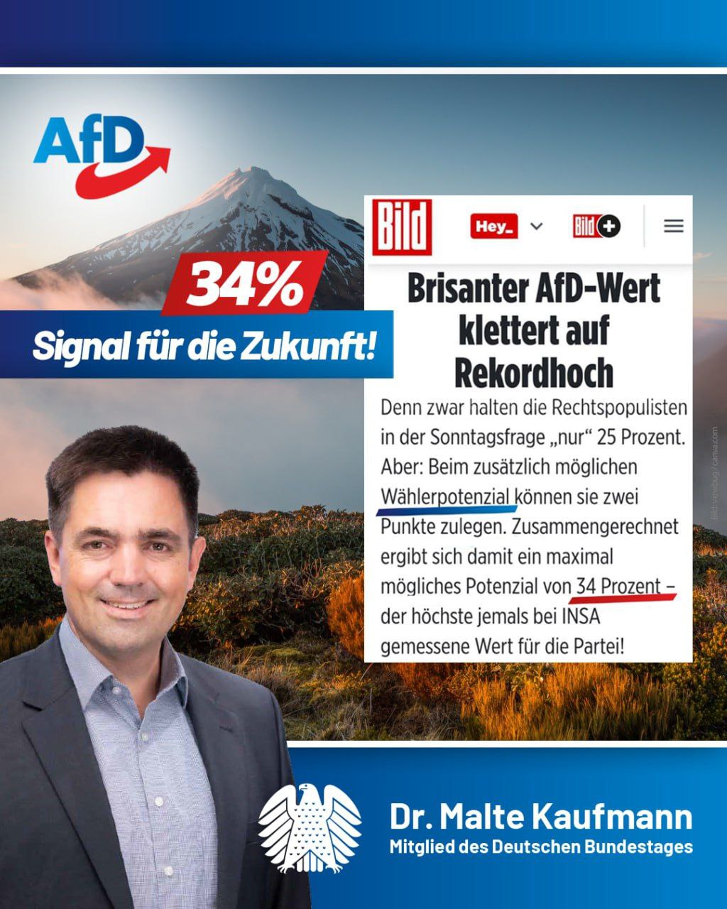 Neues INSA-Umfragehoch von 34 Prozent beim maximalen Wählerpotenzial: Mehr als ein Drittel der Deutschen ist grundsätzlich zur Wahl der Alternative für Deutschland bereit. Ein historischer Rekordwert, der die zunehmende Entfremdung vieler Bürger von der Politik widerspiegelt. Während Union, SPD und Grüne weiterhin an Rückhalt verlieren, gelingt es uns, mit klaren Positionen zur Bürgerbeteiligung und inneren Sicherheit – wie etwa in unseren Anträgen zur Stärkung der direkten Demokratie und zum Schutz des Sozialstaats vor ungesteuerter Migration – wichtige Themen der Bevölkerung aufzugreifen und nicht wie gerade im Kölner Wahlkampf wichtige Aufgaben zu tabuisieren, wodurch die AfD zur echten Regierungsalternative herangereift ist.