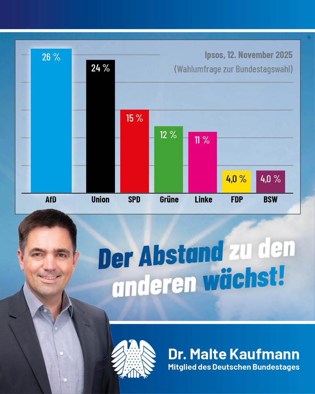 Eine aktuelle Ipsos-Umfrage zur Bundestagswahl sieht die AfD bei 26 Prozent Zustimmung (+1% zur letzten Umfrage bei diesem Institut). Damit erreichen wir einen immer größeren Abstand zur Union und zu den übrigen Parteien. Die Partei von Bundespräsident #Steinmeier, der uns ja bekanntermaßen gerne aus dem Rennen nehmen möchte, rangiert bei 15 Prozent, wobei sich die Skandalrede vom 9. November auf diese Erhebung noch gar nicht auswirkt.