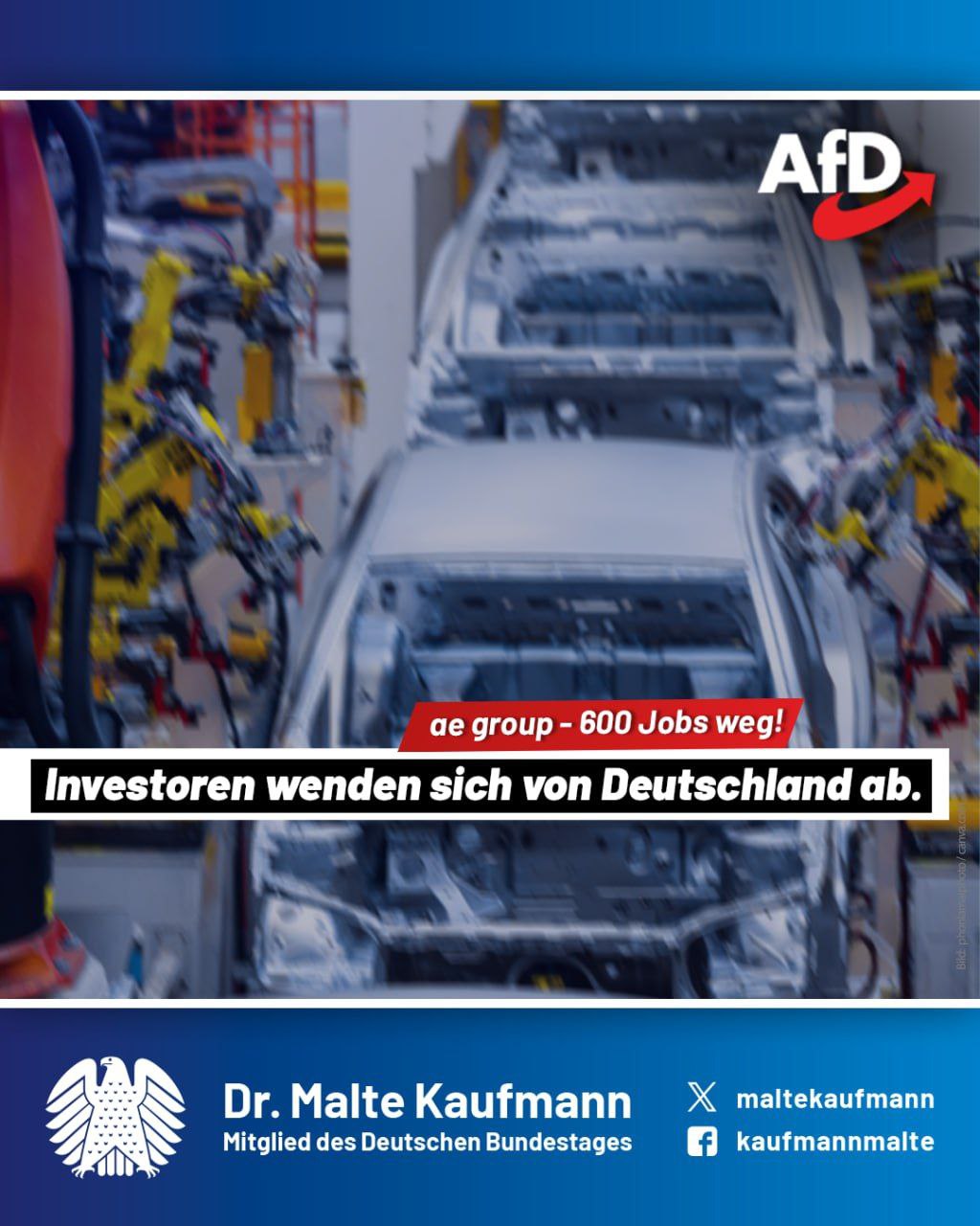 Die Krise der Automobilindustrie spitzt sich zu: 600 Arbeitsplätze bei ae group in Gerstungen stehen auf dem Spiel. Exorbitante Energiekosten, lähmende Bürokratie und eine ungewisse Zukunft für den Verbrennungsmotor setzen unsere Wirtschaft schwer unter Druck. Die AfD-Fraktion fordert eine echte wirtschaftspolitische Wende, um Wohlstand und Arbeitsplätze in Deutschland zu sichern. Das ist der einzige Weg aus der Krise!
