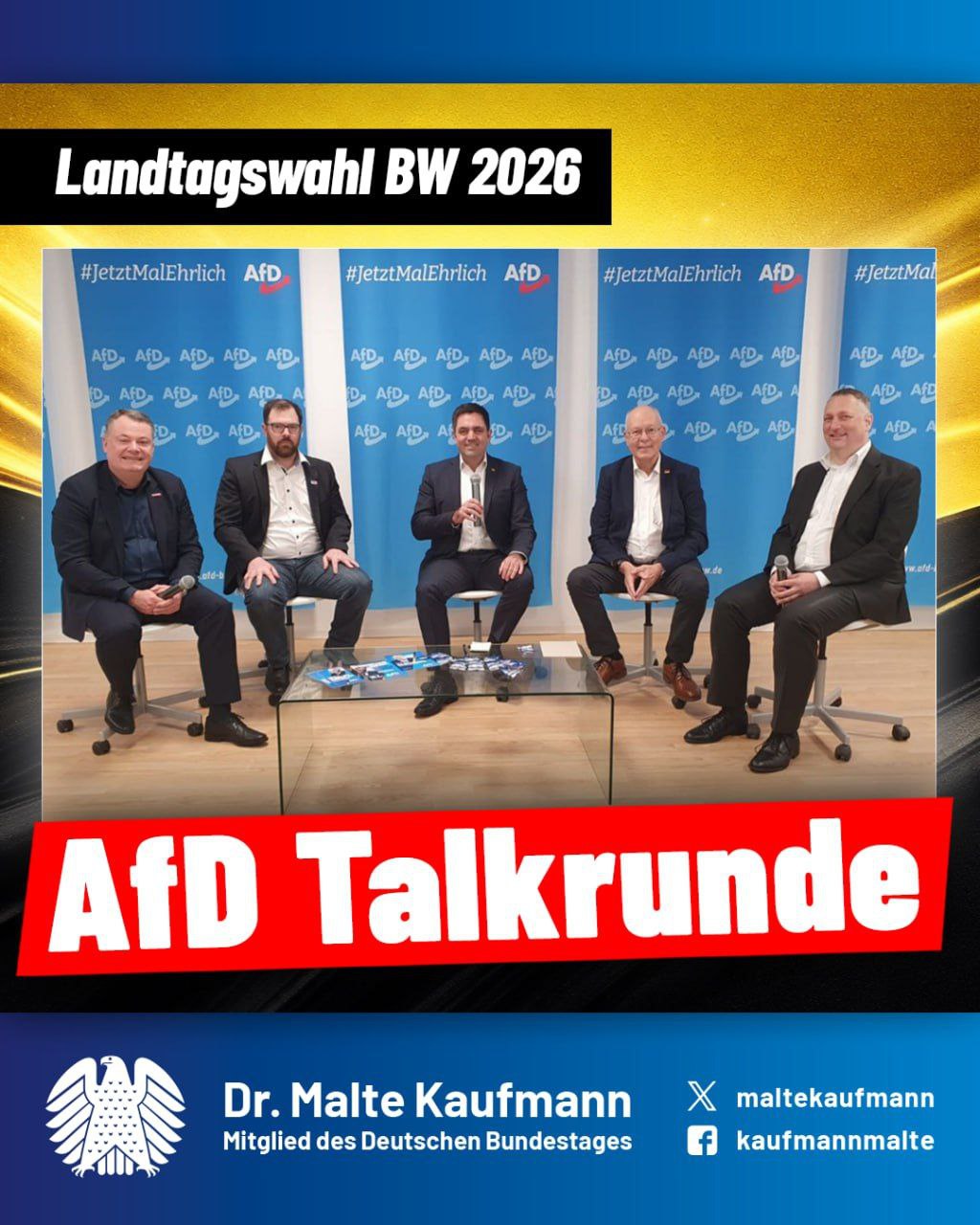 Zur #Landtagswahl in Baden-Württemberg moderierte ich eine Talkrunde mit einigen beispielhaften, kompetenten #AfD-Kandidaten unserer Region zum „Superwahljahr 2026“: Sachliche Diskussionen zu Themen wie Verkehrspolitik, Finanzstabilität und innerer Sicherheit. Unsere Kandidaten haben fundierte Expertise und pragmatische Lösungen aus jahrelanger kommunaler Praxis, fernab ideologischer Experimente!