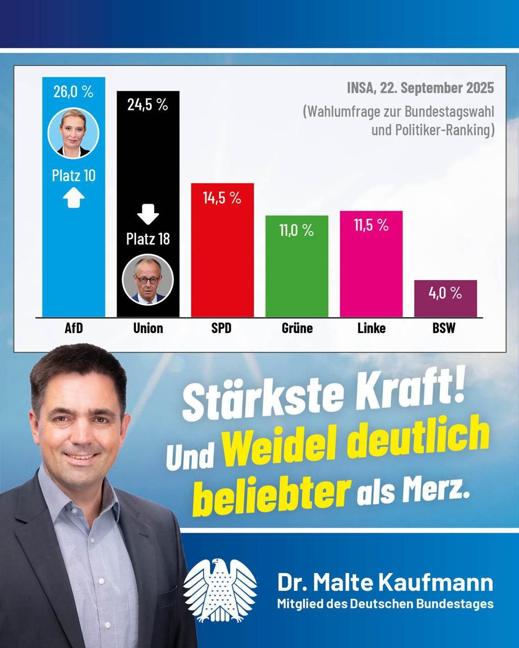Im aktuellen Politiker-Ranking von INSA stürzt Kanzler Merz auf Platz 18 ab. Er ist unbeliebter als sein Vizekanzler Klingbeil, unbeliebter als Markus Söder, sogar unbeliebter als Katharina Dröge! Und deutlich unbeliebter als die Oppositionsführerin Alice Weidel, die sich auf Platz 10 verbessert. Insgesamt ist unsere #AfD inzwischen mit sich immer weiter vergrößerndem Abstand stärkste Kraft, und es dürfte weiter bergab gehen für die Union, wenn sie sich nicht endlich aus dem Klammergriff der absteigenden linken Kräfte befreit.