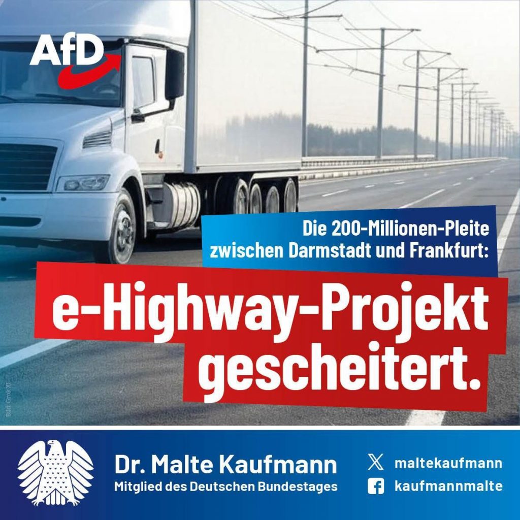 Das Ende einer weiteren grünen Utopie: Nachdem 200 Millionen Steuergeld in den Ausbau von eHighways gesteckt und die Strecke in Hessen im letzten Jahr von Minister Habeck nochmal für 22 Millionen auf das Doppelte verlängert wurde, wird jetzt wahrscheinlich ein zweistelliger Millionenbetrag für den Abbau der Strommasten anfallen. Obwohl es viele Mahner gab und auch das europäische Ausland keinerlei Interesse an diesem Pilotprojekt zeigte, hielt der grüne Minister an den Oberleitungen fest, die durchschnittlich von 10 (in Worten: zehn!) oberleitungsfähigen LKWs genutzt wurden. Grüne Geldvernichtung, mit der wir aufräumen werden!
