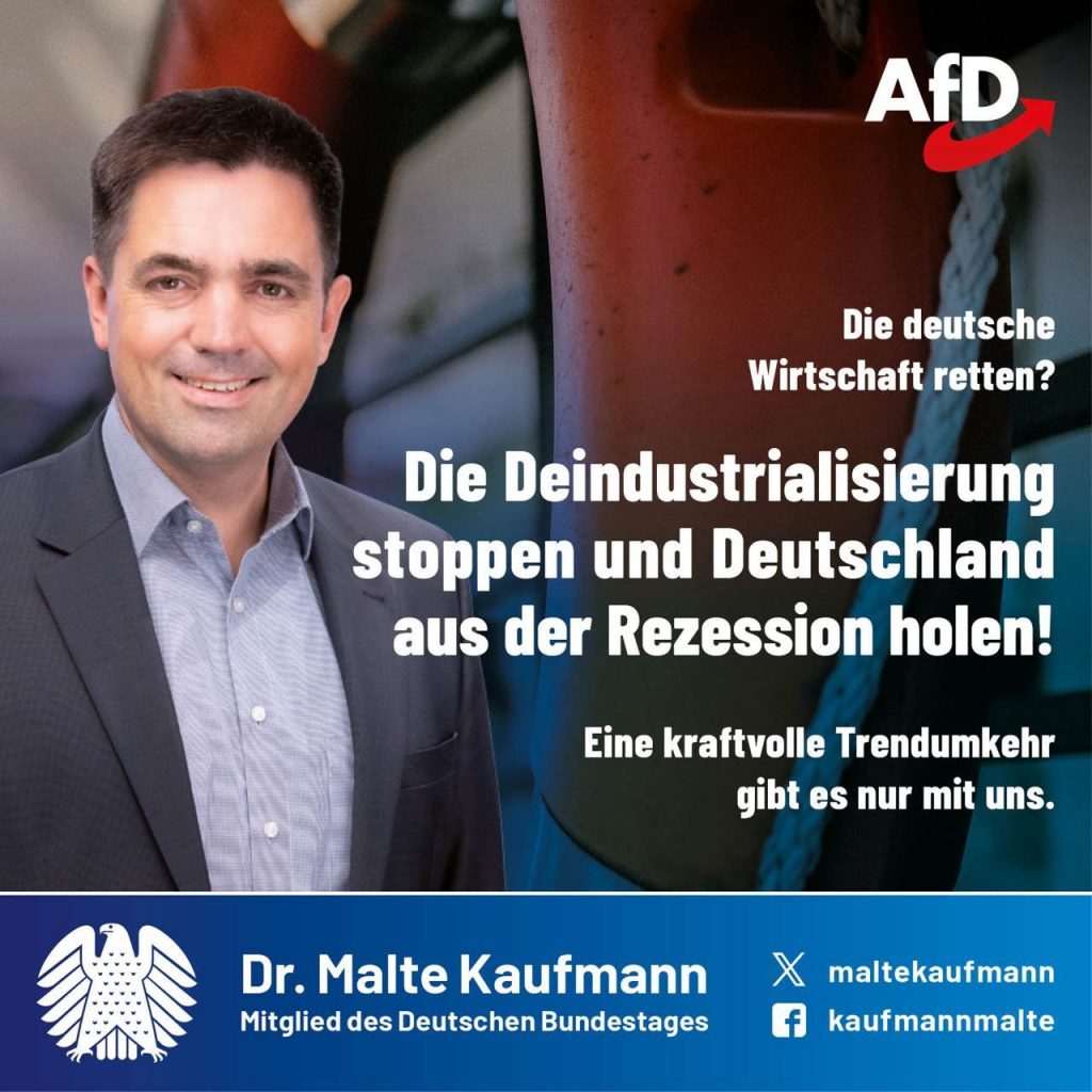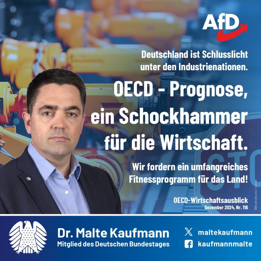 Laut OECD-Wachstumsprognose ist Deutschland das Schlusslicht unter den Industrienationen – und es wird immer schlimmer. Eine verfehlte Politik und die geplante, defacto Abschaffung der Schuldenbremse verschärfen die Krise. Deutschland braucht ein Fitnessprogramm um wieder wettbewerbsfähig zu werden. Nur die AfD bietet eine echte wirtschaftliche Erneuerung. Lesen Sie hierzu meine Pressemitteilung: https://afdbundestag.de/malte-kaufmann-deutsche-wirtschaft-braucht-planbarkeit-und-sicherheit/