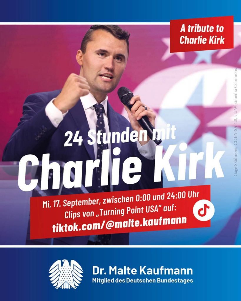 Charlie Kirk war ein herausragend kluger, freiheitsliebender, patriotischer und gläubiger junger Familienvater. Sein Tod hat nicht nur die USA geschockt, sondern auch bei uns Entsetzen ausgelöst. Manche jedoch verbreiten Häme und Falschinformation – was angesichts der Brutalität gegen einen so freundlichen und offenen Menschen nicht zu fassen ist. Ich möchte dazu beitragen, dass die gute Sache, für die Charlie Kirk stand, nicht in den Schmutz gezogen wird durch Lügen über eine angeblich falsche Gesinnung: Überzeugen Sie sich selbst und schauen Sie am Mittwoch, 17.9.25 zwischen 0:00 und 24:00 Uhr auf meinem Tiktok-Kanal in die Videos von “Turning Point USA” rein unter: https://vm.tiktok.com/ZNHnQkutqeRbN-3wDTj