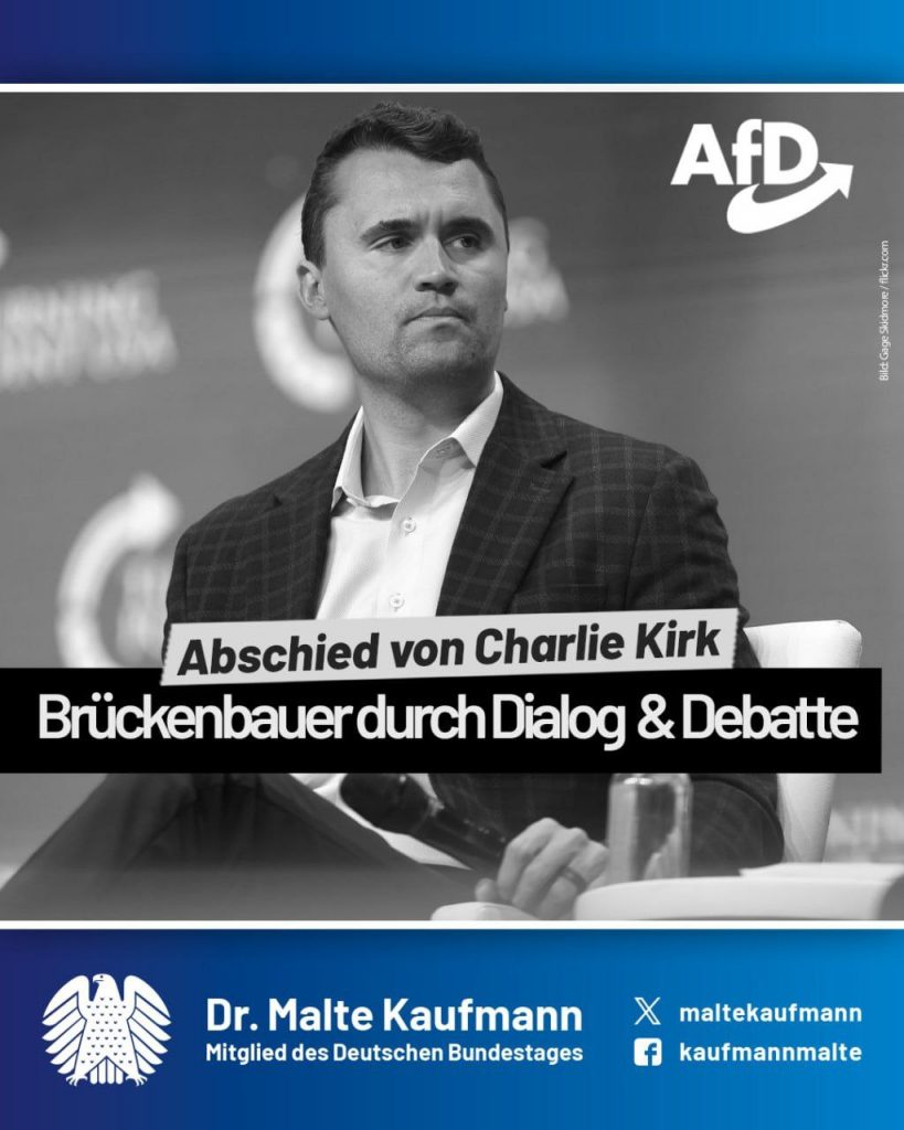 Heute nehmen wir Abschied von Charlie Kirk, dessen Leidenschaft für offene Debatte und respektvollen Dialog uns alle inspiriert hat. Seine Überzeugung, als entschiedener Christ Grundwerte stets durch Argumente und Überzeugungsarbeit zu vertreten, statt durch Gewalt, ist ein Vermächtnis, das weit über sein Wirken hinausgeht. Kirk zeigte, wie wichtig Freiheit der Rede und sachliche Kontroverse für eine demokratische Gesellschaft sind. Sein Mut, unbequeme Wahrheiten auszusprechen und trotzdem die Brücke zum offenen Gespräch zu schlagen, bleibt ein Vorbild für alle, die an eine echte politische Kultur glauben. Unser tiefes Mitgefühl gilt in diesen schweren Stunden insbesondere seiner Familie. Besonders seiner Frau gebührt Bewunderung und Respekt, die sich entschieden hat, sein Engagement fortzuführen und die Organisation “Turning Point USA” in seinem Sinne weiterzuführen. Möge sein Geist des Dialogs, der Freiheit und des Mutes in ihr und in uns allen weiterleben.
