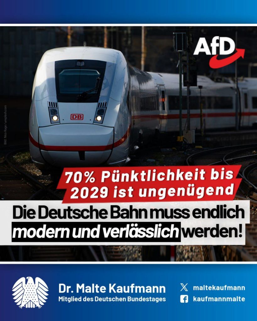 Die Bundesregierung senkt die Ansprüche: 70 % Pünktlichkeit bei der Bahn bis 2029 als neues „Ziel“. Das ist ein Offenbarungseid für das Scheitern der bisherigen Verkehrspolitik! Die Bahn muss grundlegend reformiert werden. Es kann nicht sein, dass Tunnelprojekte und Prestige-Radwege im Ausland wichtiger sind als die Sanierung und Kapazitätserweiterung des Schienennetzes. Die Bürger wünschen sich Verlässlichkeit, wenn schon nicht von der Regierung, dann doch wenigstens von der zerfallenden Infrastruktur. Wir werden Planung und Bau beschleunigen, Bürokratie rigoros abbauen und die Mittel gezielt in die Wartung und Digitalisierung des bestehenden Netzes investieren. Nur so erreichen wir echte Pünktlichkeit und stärken die Bahn als Rückgrat des öffentlichen Personen- und Güterverkehrs. ➡️ https://www.welt.de/wirtschaft/article68d102b11aea417f4453d77c/Verkehrsminister-Schnieder-senkt-Puenktlichkeitsziele-der-Bahn-und-verkleinert-Vorstand.html