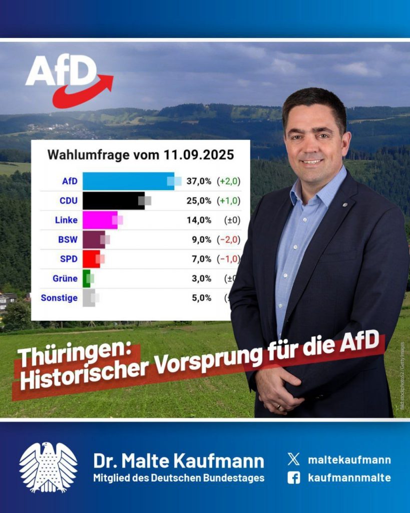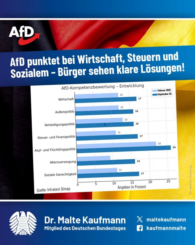 Laut Deutschlandtrend ist für viele Bürger die AfD die kompetenteste Kraft. Insbesondere bei der Asylpolitik liegt sie klar vor der Union. Auch bei Wirtschaft, Finanzen und Gerechtigkeit wächst das Vertrauen laut Umfragen spürbar. Unsere klaren, ehrlichen Positionen überzeugen. Wir setzen auf nachhaltige Entlastung bei Steuern und Abgaben, Förderung des Mittelstands und Abbau überflüssiger Bürokratie, um die strukturellen Probleme im Land anzugehen. Mit klaren Alternativen zur rot-grünen Steuer- und Umverteilungspolitik, wie im Antrag 20/3559 – „Inflation bekämpfen, Steuer- und Abgabenlast senken, Energiepreise wettbewerbsfähig machen“ beschrieben. Nur mit der AfD gibt es echte Lösungen statt teurer Symbolpolitik – für sichere Sozialsysteme und eine erfolgreiche Wirtschaft in Deutschland! ➡️ https://www.welt.de/politik/deutschland/article68b7097428ef4f2369ca9aa9/deutschlandtrend-deutsche-schreiben-afd-in-asylpolitik-groessere-kompetenz-zu-als-der-union.html