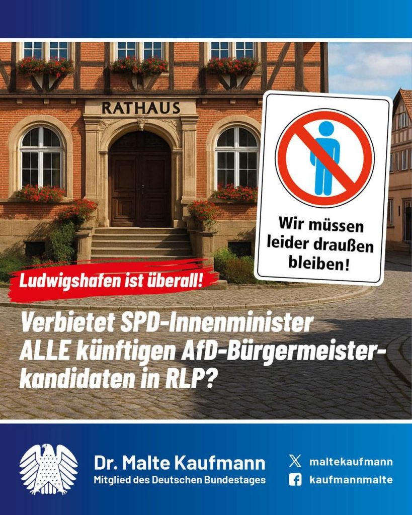 Schon vor dem Wahlausschluss des Ludwigshafener OB-Kandidaten hat das rheinland-pfälzische Innenministerium im Juli 2025 vorgesorgt: Jeder Wahlbewerber muss eine „Belehrung über die gesteigerte Pflicht zur Verfassungstreue“ unterzeichnen und auf einer Liste „extremistische Organisationen“ ankreuzen, denen er angehört. Der Skandal: Die AfD steht dort auch! In Nieder-Olm wurde beim Bürgermeisterkandidat Roberto Kiefer (AfD) diese Gesinnungsprüfung offenbar als Testballon gestartet. Nieder-Olm hat nun nach Protesten die „Belehrung über die gesteigerte Pflicht zur Verfassungstreue“ und die Liste mit der AfD auf einer anderen Webseite für die Bürgermeisterwahl versteckt. Die #Hexenjagd auf die AfD setzt sich also unvermindert fort. Wir werden uns mit allen verfügbaren Mitteln gerichtlich wehren, sowie aktives und passives Wahlrecht gegen diese totalitären Bestrebungen verteidigen.