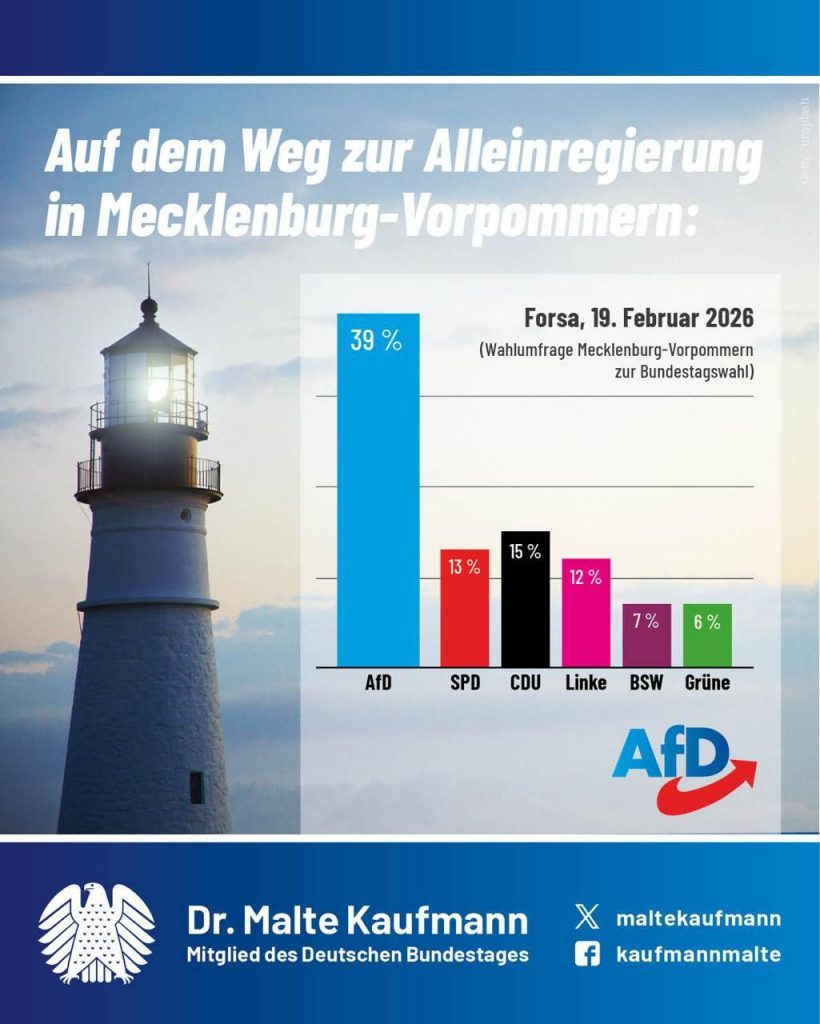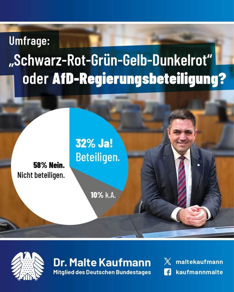 Eigentlich ist es in der Bundesrepublik so üblich, dass die Partei mit dem besten Ergebnis bei einer Landtagswahl für sich selbst einen Regierungsauftrag sieht. Und eigentlich ist es dann auch logisch, dass der Spitzenkandidat dieser Partei Ministerpräsident wird und eine Regierungsmehrheit bildet. Würde das uneingeschränkt für alle „Demokraten“ gelten, hätten wir bereits einen AfD-Ministerpräsidenten – und zwar in Thüringen. Das Institut für Online-Marktforschung „Yougov“ hat nun ermittelt, ob die Deutschen der Meinung sind, dass die #AfD an einer Landesregierung beteiligt (!) werden soll, wenn sie das stärkste (!) Ergebnis von allen einfährt, die Wahl also gewinnt. Immerhin etwa ein Drittel der Deutschen haben das bejaht. ▶️ https://tinyurl.com/mw8sx35f Mich würde einmal interessieren, wie die Umfrage ausgeht, wenn man sie umgekehrt stellt: „Sollten sich alle Parteien links der Brandmauer zu einer Koalition zusammenschließen, wenn dadurch eine Beteiligung der AfD verhindert wird?“ – Was meinen Sie?