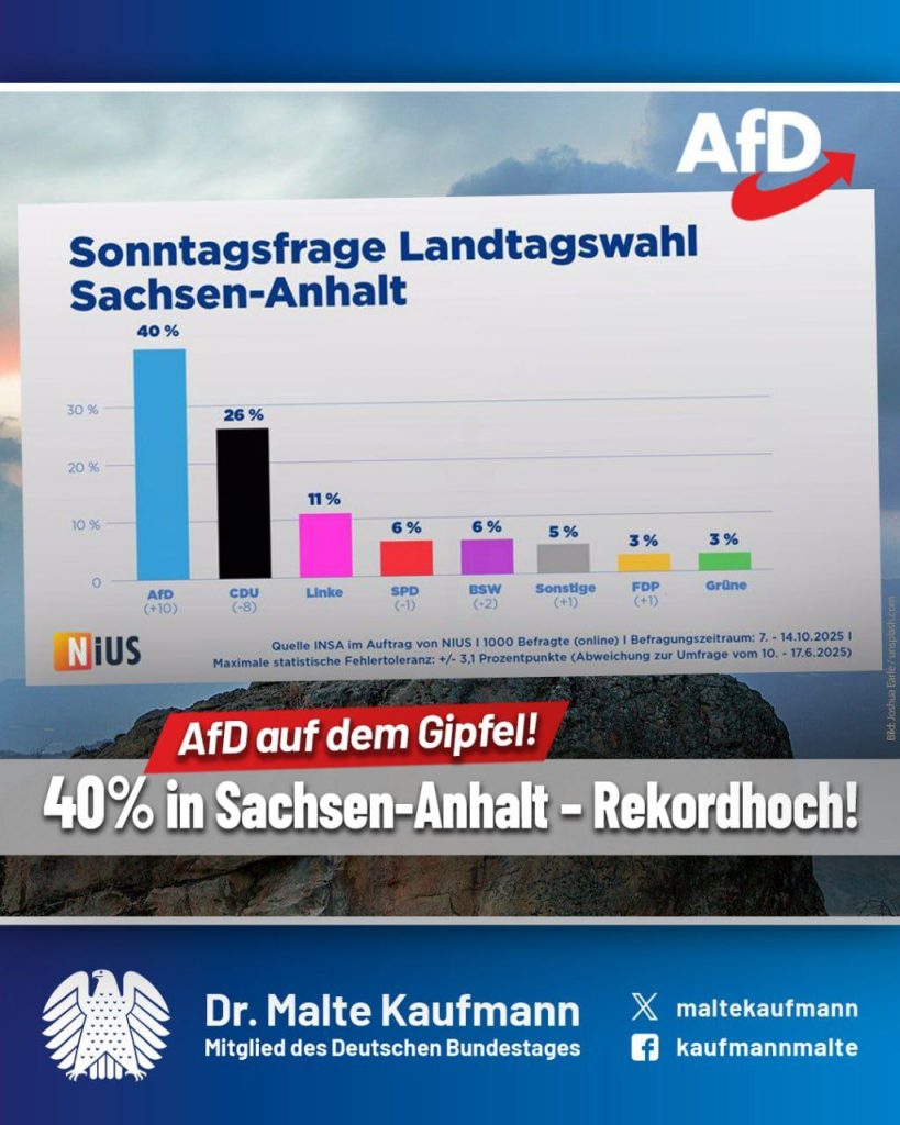 AfD-Umfrage-Rekord in Sachsen-Anhalt: 40% – Ein Meilenstein! Sensation in Sachsen-Anhalt! Die neueste INSA-Befragung katapultiert die AfD auf 40 Prozent – unser bisher höchster Wert! Im Vergleich zu Juni ein Plus von 10 Punkten. Die CDU sackt auf 26% ab der Rest der Parteien folgt weit abgeschlagen. Um eine Mehrheit zu bilden, müsste die CDU eine „Brandmauer“-Koalition mit Linke, BSW und SPD eingehen – ein klares Zeichen, dass die etablierten Parteien in der Defensive sind! Unser Kandidat Ulrich Siegmund liegt mit 22% vor CDU-Mann Sven Schulze. Die Menschen wollen einen Politikwechsel! Die AfD steht für starke Politik in Migration, Sicherheit und Wirtschaft. Lasst uns diesen Schwung nutzen für die Landtagswahl 2026. ➡️ nius.de/statistik/news/neuer-umfrage-rekord-afd-klettert-in-sachsen-anhalt-auf-40-prozent-cdu-muesste-brandmauer-koalition-mit-linke-bsw-und-spd-schliessen/c2393b0e-16a7-499d-a746-62854caf112c