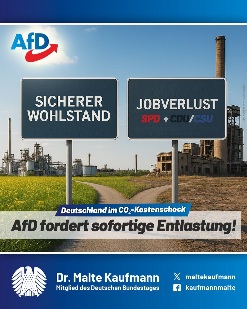 Die AfD fordert seit langem die Rücknahme des CO2-Preises, niedrigere Energiepreise und konsequenten Bürokratieabbau (BT-Drs. 20/5588 „Abschaffung des nationalen Emissionshandels – Wettbewerbsfähigkeit sichern.“; BT-Drs. 20/7751 „CO₂-Preis aussetzen – Standort und Wohlstand schützen!“; BT-Drs. 20/3701 „Bezahlbare Energie für Industrie und Mittelstand – Energiesteuern absenken, CO₂-Preis abschaffen.“). Nur so können Wettbewerbsfähigkeit, Investitionen und Arbeitsplätze in Deutschland dauerhaft gesichert werden!