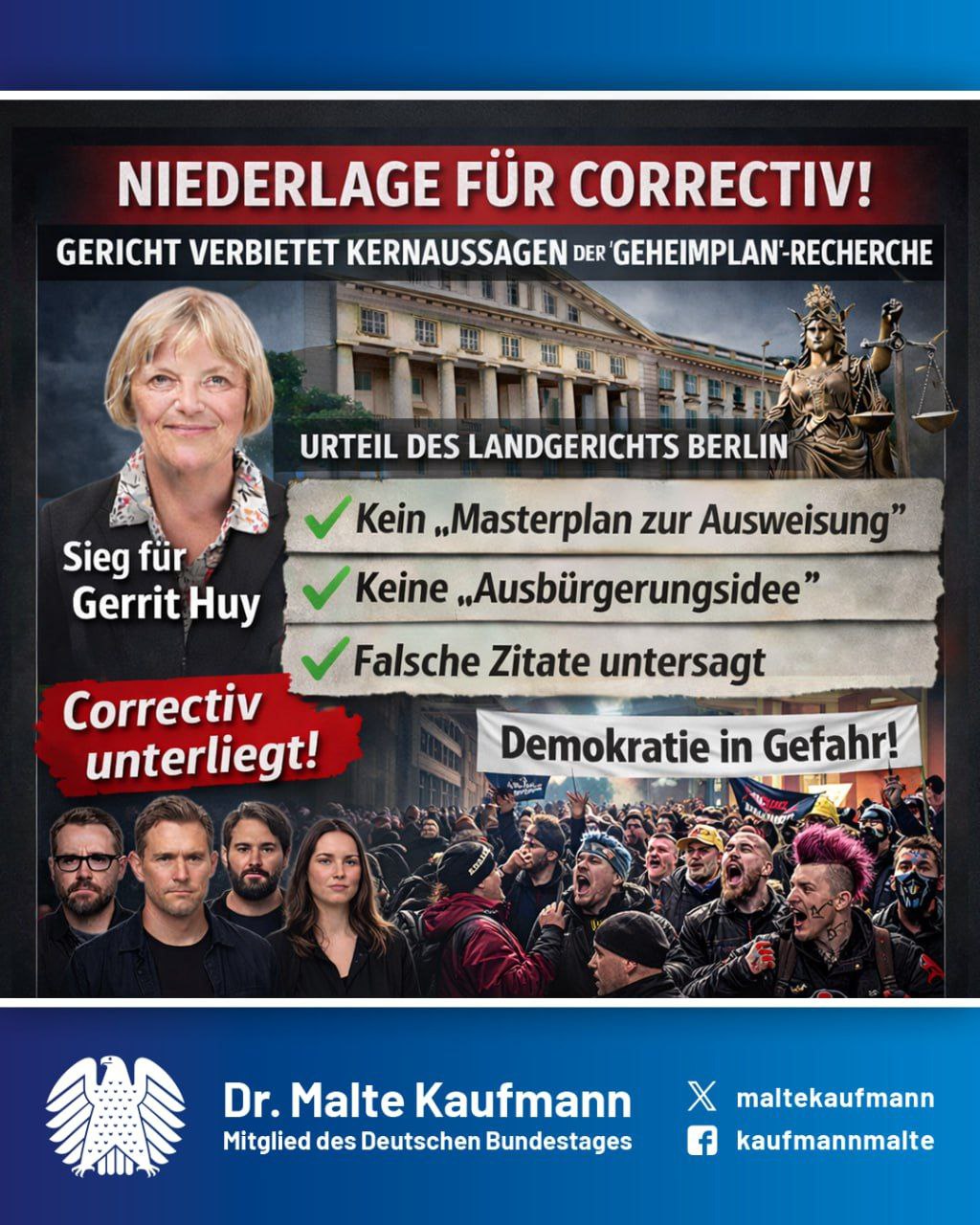 Endlich – #Correctiv wurde korrigiert! Das Landgericht Berlin gab Gerrit Huy (AfD), MdB, Recht. Sie war im Nov. 2023 bei einem Treffen mit Sellner im Landhaus Adlon, Potsdam, dabei. Das Gericht verbot Correctivs Kernaussage „Masterplan zur Ausweisung deutscher Staatsbürger“. Bislang hatte Correctiv diese Aussage stur als Meinungsäußerung verteidigt. Der normale Leser versteht diese Behauptung jedoch als Tatsache, so das Gericht. Außerdem untersagte das Gericht Correctiv das Verbreiten von Sellners angeblicher „Ausbürgerungsidee“ für deutsche Staatsbürger. Damit stürzt Correctivs #Kartenhaus zusammen. Unseriöse Plattformen wie Correctiv, die ständig neue Geschichten erfinden, dürfen nicht mehr mit unseren Steuergeldern alimentiert werden. Danke, Gerrit Huy. #AfD wirkt!