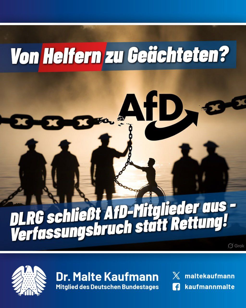 Stellen Sie sich vor: Ehrenamtliche Helfer, die Ertrinkende aus Wellen ziehen, werden nun selbst ertränkt – in einem Meer aus Ideologie! Der #DLRG-Landesverband #Württemberg hat seine Satzung verschärft und schließt AfD-Mitglieder pauschal aus. Ein Akt zutiefst undemokratischer Hybris! Während die Organisation von „Demokratie“ predigt, verletzt sie das #Grundgesetz (Art. 3): Keine Benachteiligung wegen politischer Anschauungen. Absurdität pur: Dürfen AfDler künftig keine Leben retten? Humanität wird zur Parteifrage – ein Relikt dunkler Zeiten, das Entmenschlichung fördert. Wo endet das? Bei der Verweigerung von Hilfe für „Falschdenkende“?