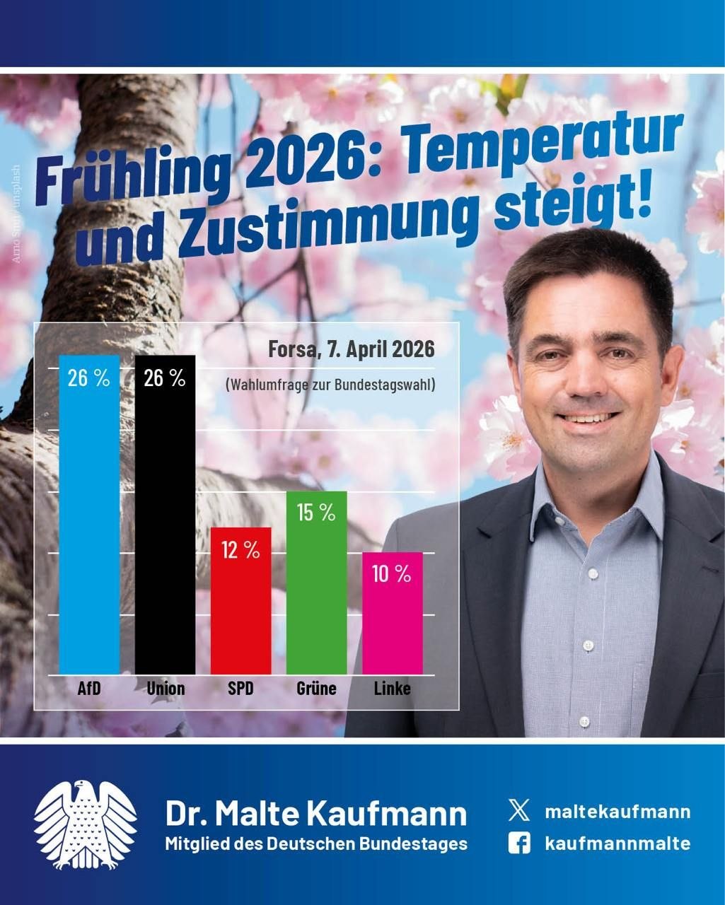 Liebe Leser, ich hoffe, Sie hatten schöne Ostertage und konnten die Sonne genießen, die sich jetzt immer öfter zeigt, und sowohl die Temperatur anhebt, als auch die Laune. Denn trotz der vielen schlechten Meldungen in den letzten Wochen und Monaten hat unser Land Optimismus verdient! Die steigenden Zustimmungswerte für unsere #AfD bei den vergangenen Kommunal- und Landtagswahlen sowie die Prognosen für die in diesem Jahr noch folgenden Wahlen belegen: Wir erreichen immer mehr Menschen, die die Notwendigkeit eines politischen Wandels verstehen und ihn mit uns zusammen angehen wollen. Narrative kippen, politische Null-Aussagen werden durchschaut – Leere Versprechen treiben eben keine echten Blüten! #VISION2026