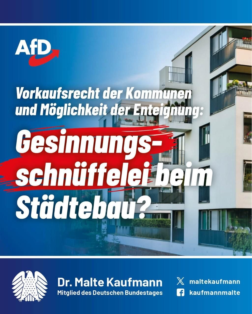Nahezu täglich erreichen uns immer neue, äußerst phantasievolle Ideen der Bundesregierung, wie die Freiheit der Bürger eingeschränkt werden könnte. Aus dem Ministerium von Bauministerin Hubertz (SPD) kommt jetzt ein Gesetzentwurf, der das Städtebau- und Raumordnungsrecht „modernisieren“ soll. Die Idee ist, dass die Kommunen künftig beim Verfassungsschutz und beim BKA Informationen über potenzielle Käufer von Immobilien einholen können und sich ein Vorkaufsrecht sichern können, wenn ihnen der Käufer nicht passt. Außerdem soll die Möglichkeit geschaffen werden, Immobilien zu enteignen – etwa wenn „eine nachteilige Ausstrahlungswirkung auf die Umgebung“ vermieden werden kann. Unfassbar ist dieser neue Versuch, ins Eigentum der Bürger einzugreifen! Nur die #AfD stellt sich konsequent gegen jedes Gesetz, das Leben, Freiheit und Eigentum immer weiter einschränkt und der Kontrolle der Regierung unterwirft!