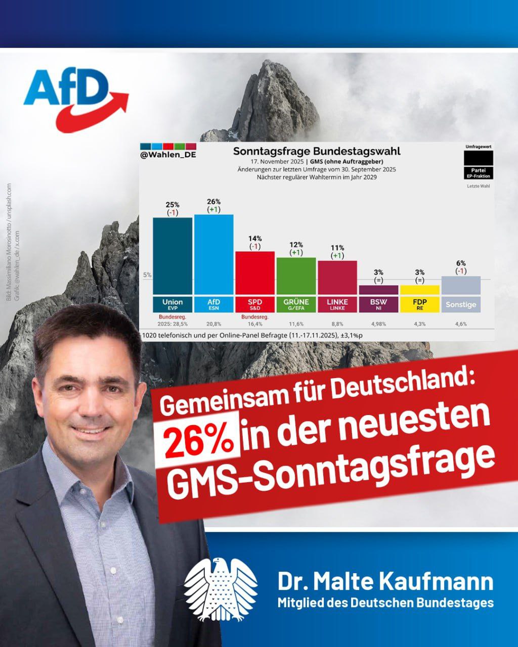 In der gestrigen GMS-Sonntagsfrage zur Bundestagswahl erreichten wir stolze 26% (+1) und belegen nach wie vor Platz 1. Warum? Weil wir den Bürgern zuhören und ihre Sorgen ernst nehmen. Die Menschen wollen eine Politikwende. Sie wollen ihren Wohlstand sichern, günstige Energie, Steuersenkungen und ein schönes Stadtbild.