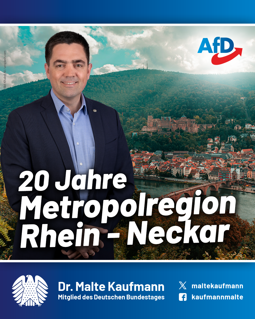 IHeute Abend findet in Mannheim die Feierstunde 20 Jahre Metropolregion Rhein-Neckar statt. Wir als AfD-Fraktion in der Verbandsversammlung sagen herzlichen Glückwunsch und alles Gute für die Zukunft! Hoffentlich werden die Weichen richtig gestellt. Wir bringen uns jedenfalls konstruktiv ein und hoffen auf einen politischen Ruck durch die Wähler bei den nächsten Landtagswahlen.