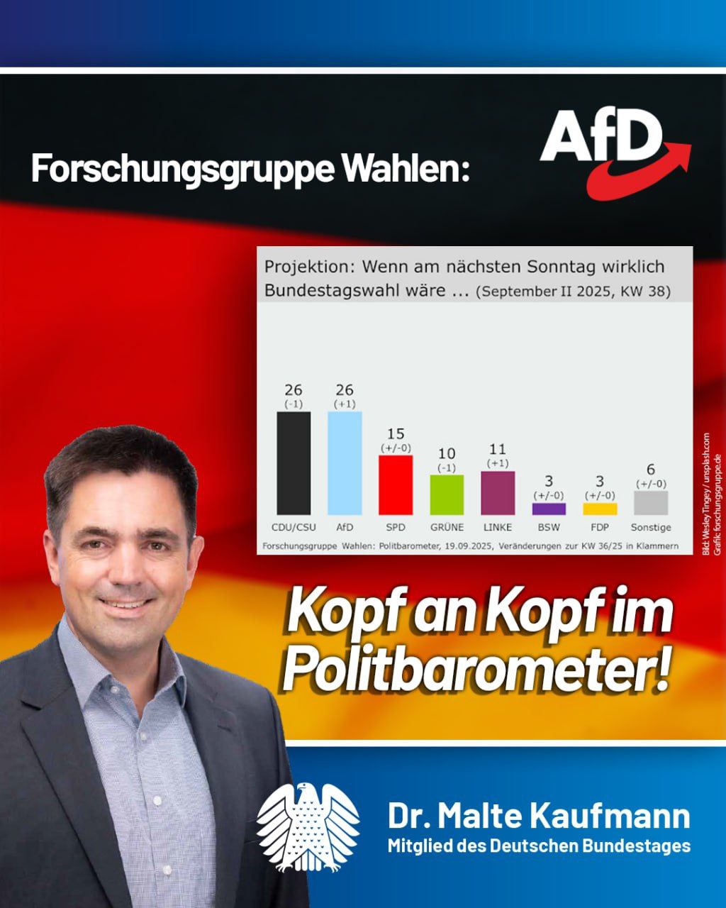 Das Politbarometer September II der Forschungsgruppe Wahlen markiert einen weiteren Rekordstand: Die AfD erreicht mit 26 Prozent ihren höchsten je gemessenen Wert bei dem Verein und zieht erstmals mit der Union aus CDU/CSU gleich. Der zunehmende Unmut über ausufernde Verschuldung und ungelöste Sicherheitsfragen stärken das Vertrauen in unsere Partei. Immer mehr Bürger erkennen, dass eine solide, ideologiefreie Politik im Interesse unseres Landes nur mit der AfD erreichbar ist. Deutsche fordern endlich eine Politik für die eigenen Bürger statt für Ideologien. Deutschland braucht eine echte Alternative!