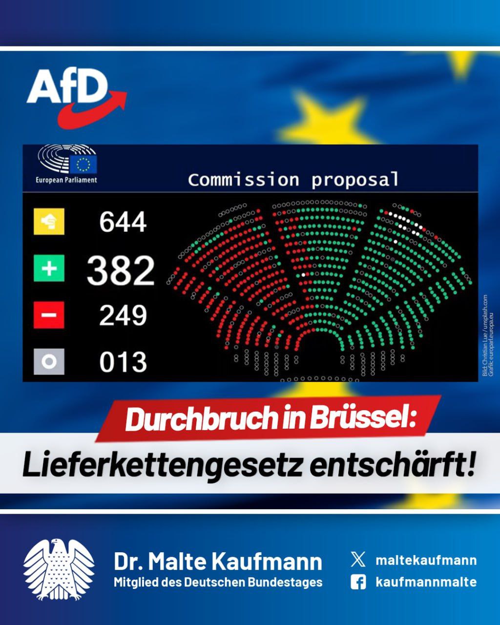 Im EU-Parlament wurde ein Meilenstein erreicht: Mit einer klaren Mehrheit von 382 Stimmen haben wir dazu beigetragen, das Lieferkettengesetz zu entschärfen. Dennoch fordern wir die komplette Streichung des Gesetzes, da es unnötige Belastungen schafft und die Wirtschaft lähmt.