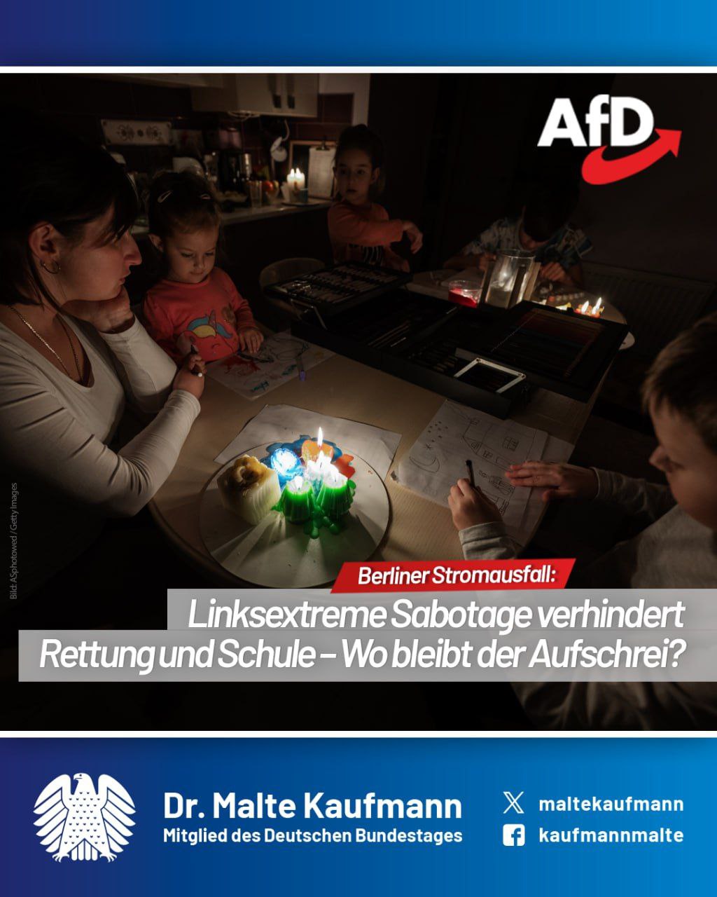 Linksextreme Brandstiftung legt Berlin lahm: 43.000 Haushalte, Pflegeheime und Firmen ohne Strom, Notrufe blockiert, S-Bahn steht still – die linke Gruppe „Switch Off“ bekennt sich offen auf Indymedia zum Anschlag auf die kritische Infrastruktur. Ziel: gezielte Sabotage, Hass auf Technik und unsere Gesellschaft. Leidtragende sind Bürger, Kranke und Schwächste. Politik und Medien schweigen – weil die Täter ideologisch „passen“. Wir fordern Null Toleranz für linksextremen Terror, umfassenden Schutz der kritischen Infrastruktur und schonungslose Aufklärung – ohne linke Doppelstandards! Sicherheit ist nicht verhandelbar.