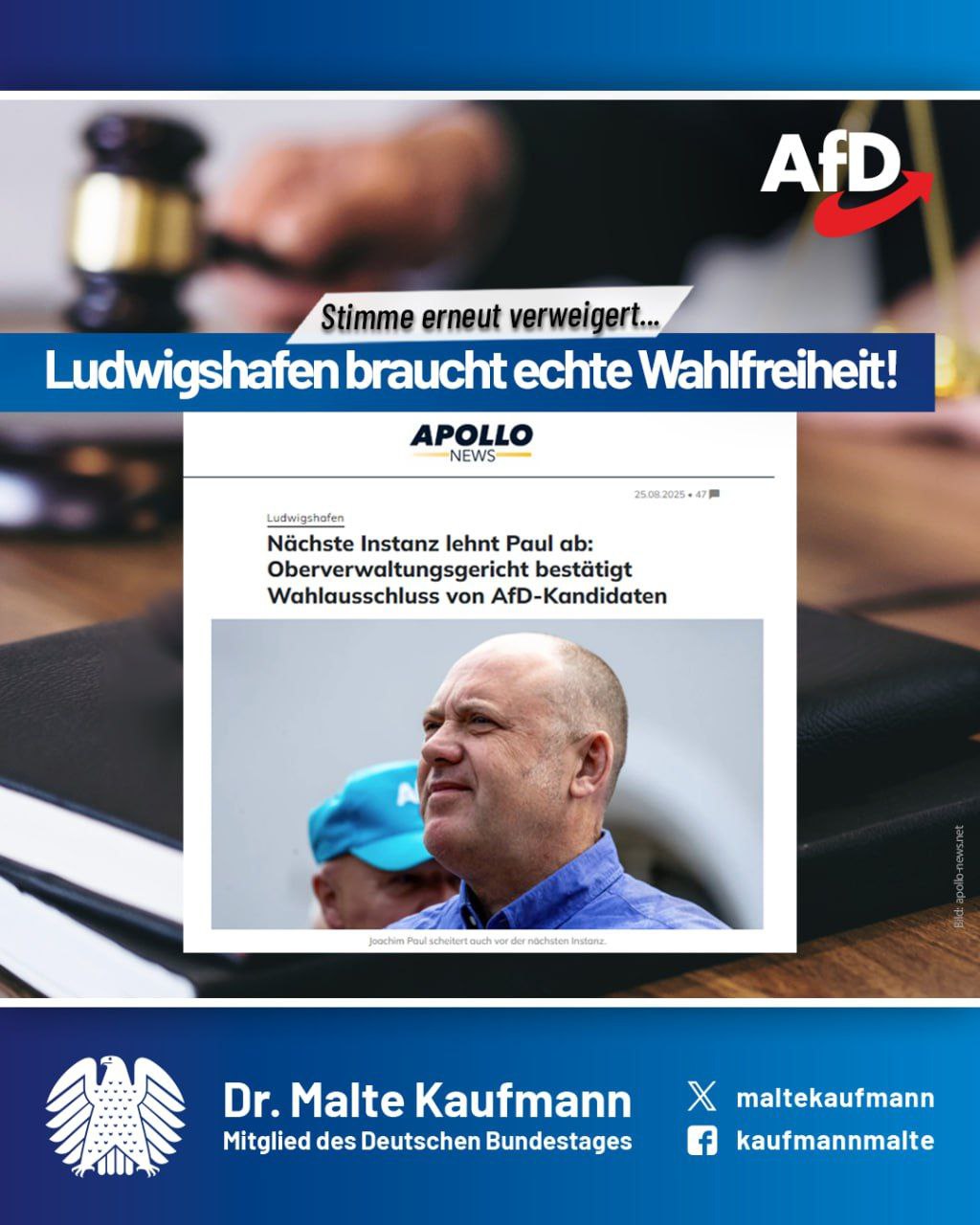 Demokratie lebt vom Wettbewerb der Meinungen – doch dieser wird in Ludwigshafen mit Füßen getreten. Das Oberverwaltungsgericht Rheinland-Pfalz hat heute den Wahlausschluss unseres Kollegen Joachim Paul als OB-Kandidat bestätigt. Offiziell werden „Zweifel an der Verfassungstreue“ angeführt – tatsächlich handelt es sich aber um politischen Ausschluss, der einzig und allein unserer wachsenden Unterstützung in der Bevölkerung geschuldet ist. Bei der letzten Bundestagswahl lag die AfD in Ludwigshafen mit 24,3 % auf Platz 1. Ein klares Zeichen, dass viele Bürger echte politische Alternativen wollen. Die Verweigerung unseres Kandidaten ist ein fatales Signal gegen Demokratie und freie, faire Wahlen! Wir stehen weiterhin für Bürgerrechte, Meinungsfreiheit und Rechtsstaatlichkeit ein. Ludwigshafen braucht die AfD und echte Demokratie braucht faire Wahlen!