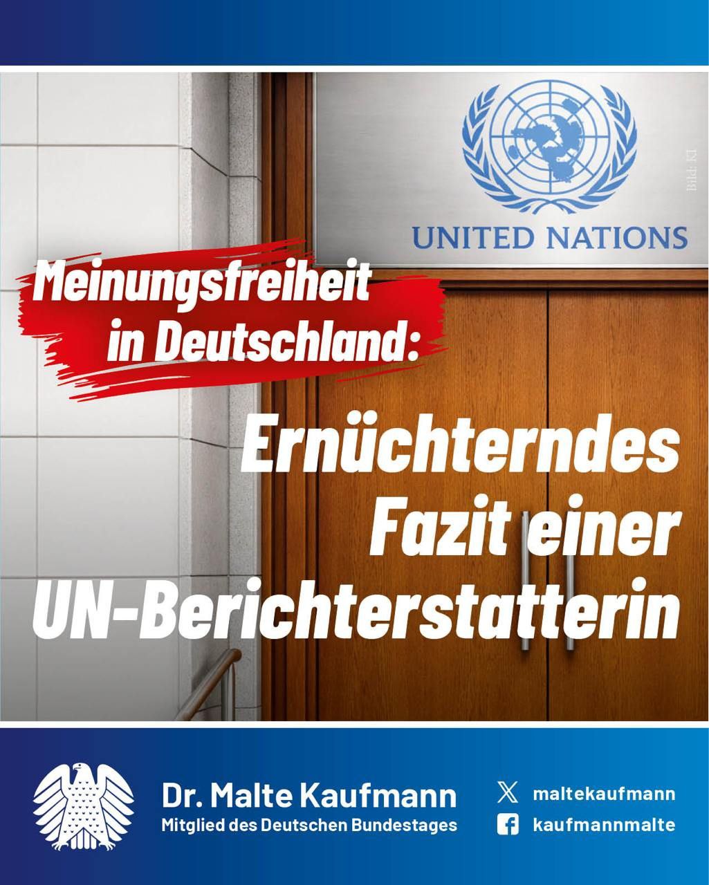 Ein Bericht der FAZ über die Warnungen der UN-Sonderberichterstatterin Irene Khan zeigt deutlich, dass es auch international erhebliche Zweifel am Zustand der Meinungsfreiheit in Deutschland gibt. Wenn selbst eine Vertreterin der Vereinten Nationen von zunehmender Selbstzensur und einem verengten Debattenraum spricht, ist das ein ernstes Alarmsignal für unsere Demokratie! Die Bundesregierung reagiert auf gesellschaftliche Spannungen zu häufig mit Verboten, Strafandrohungen und immer neuen Regulierungen, statt Vertrauen in die Bürger zu haben und die offene Debatte zu stärken.