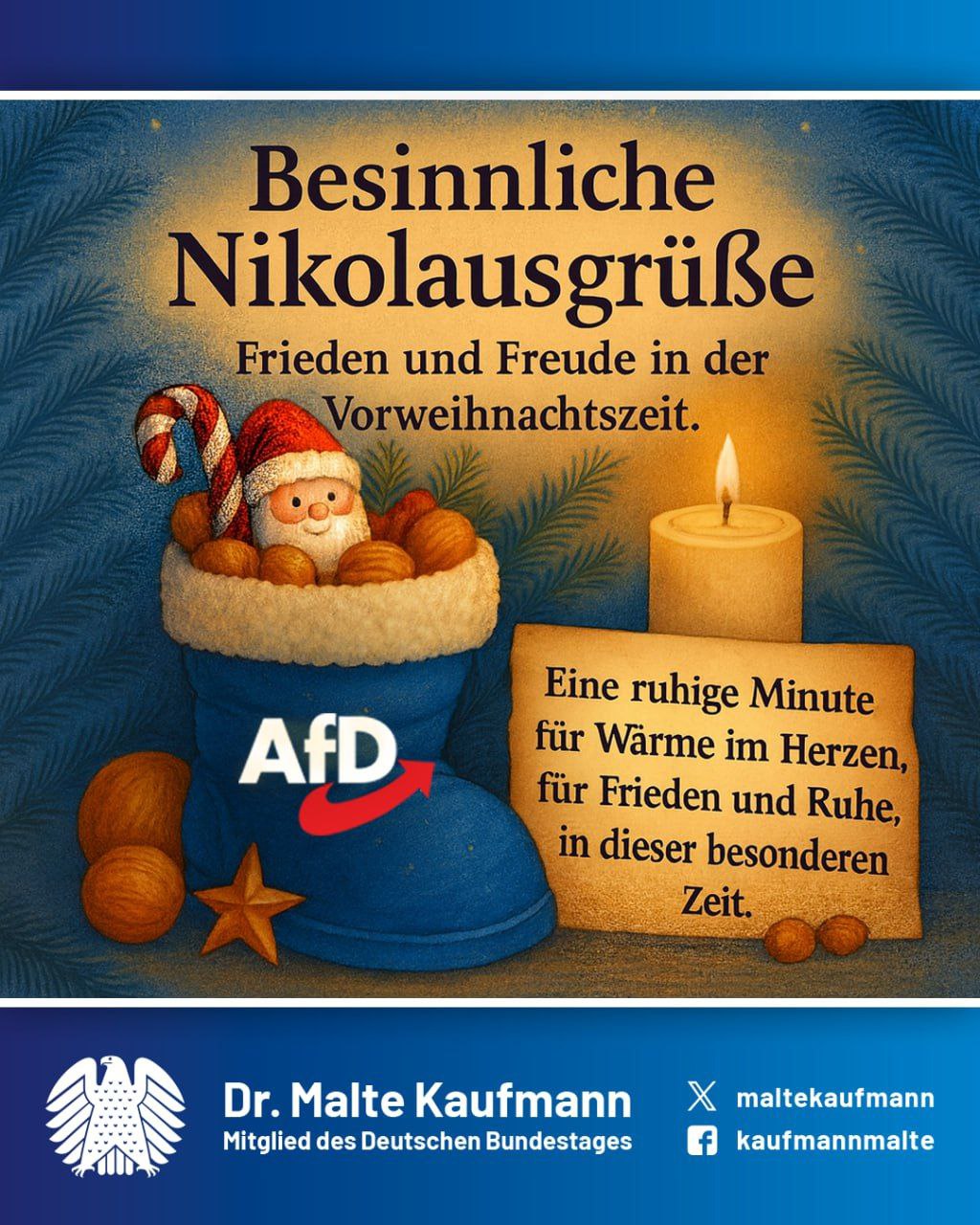 Liebe Freunde, heute erinnert uns #Nikolaus an die Güte und Großzügigkeit, mit der er selbst als Helfer in der Not in Erscheinung trat. In stiller Besinnung denken wir an die kleinen Freuden: Ein gefüllter Stiefel, ein warmer Kakao und die Magie der Vorweihnachtszeit. Mögen die vielen Gaben auch eure Herzen mit Wärme erfüllen und euch Momente der Ruhe schenken. Lasst uns teilen, was uns verbindet – Freundschaft und Hoffnung. 🎅🍫 #AfD