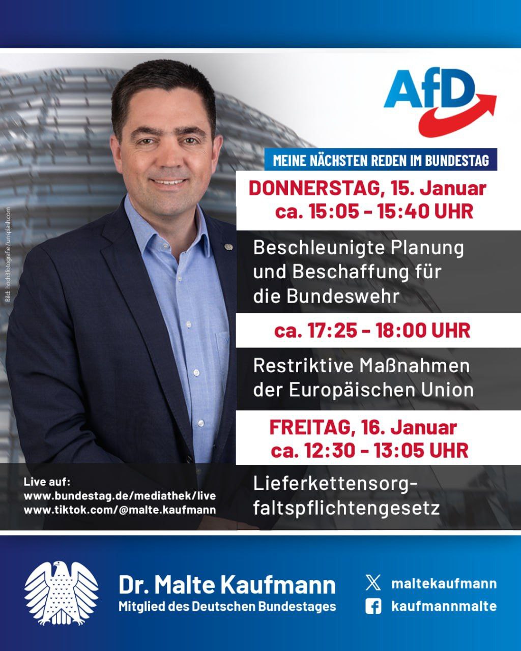 Sehen Sie meine nächsten Reden im Deutschen #Bundestag! Diese Woche stehen wichtige Debatten auf der Tagesordnung – mit direkten Auswirkungen auf Bundeswehr, Rechtsstaat und unsere Unternehmen. #AfD