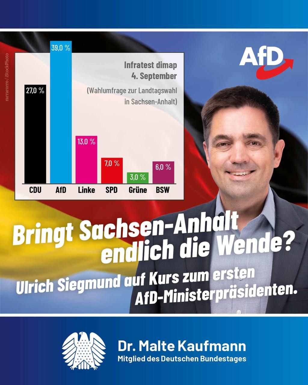 Eine Umfrage im Auftrag des MDR dürfte klar machen, wohin die Reise geht: Bereits ein Jahr vor der Landtagswahl in Sachsen-Anhalt nimmt unser AfD-Spitzenkandidat Kurs auf das Ministerpräsidentenamt. Die von Infratest dimap gemessene Zustimmung hat sich jetzt schon fast verdoppelt im Vergleich zur letzten Wahl (+19 Prozent!), und das ist noch nicht das Ende. Wenn es Ulrich Siegmund gelingen sollte, mit Hilfe der Bürger Sachsen-Anhalts eine fundamental andere, endlich wieder an deutschen Interessen orientierte Politik konsequent durchzusetzen, wird sich das auf ganz Deutschland auswirken. Unterstützen wir unsere Freunde, so gut wir können!