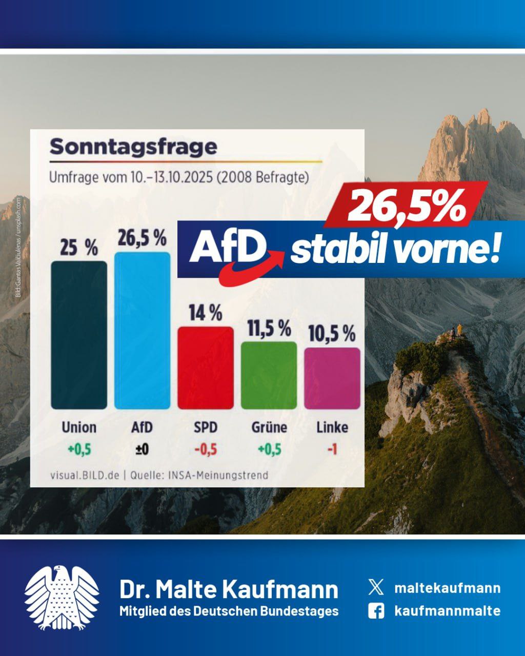 Die aktuelle INSA-Sonntagsfrage für die BILD bestätigt: Die AfD bleibt mit starken 26,5 % auf Platz eins und verweist die Union erneut auf den zweiten Rang. Immer mehr Bürger vertrauen auf unserem Kurs für Freiheit, Sicherheit und gerechte Politik. Unsere konsequente Arbeit im Bundestag – für Grenzschutz, echte Meinungsfreiheit, eine bürgernahe Energiepolitik und den Erhalt unseres Wohlstands – überzeugt Millionen Wähler.
