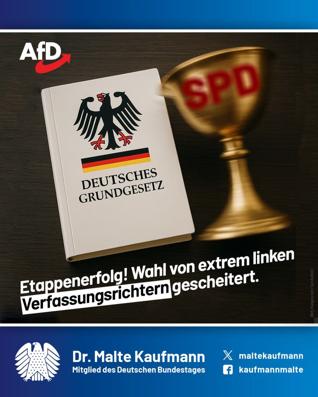 Die heutige Nicht-Wahl der Verfassungsrichter um die Personalie Brosius-Gersdorf offenbart das ganze Ausmaß der rot-schwarzen Führungsschwäche. Trotz extrem linker Ansichten und mangelnder Neutralität hielt Unionsvorsitz Jens Spahn zunächst an der SPD-Kandidatin fest. Die Kopftuchhuldigung und Befürwortung der Abtreibung im 9. Monat sind ein Armutszeugnis für unsere christliche Gesellschaft. Ein historisches Debakel, welches zeigt: Wir brauchen unabhängige Richter in Karlsruhe, nicht politische Akteure!