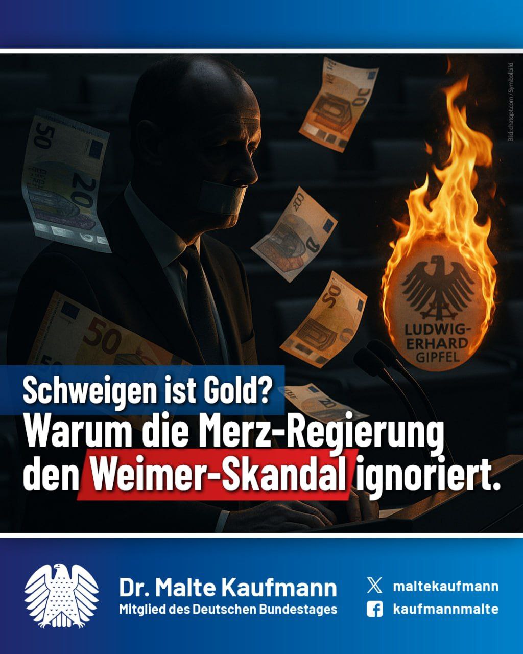 Die Fakten sind eindeutig – warum regt sich kaum wer auf? Kulturstaatsminister Wolfram Weimer steht unter massivem Korruptionsverdacht: Seine Weimer Media Group soll beim Ludwig-Erhard-Gipfel für bis zu 80.000 Euro „Einfluss auf politische Entscheidungsträger“ verkauft haben, inklusive Zugang zu Kabinettskollegen. Doch wo bleibt die Empörung? Die Opposition fordert Aufklärung, die AfD sogar den Rücktritt, aber die Merz-Regierung schweigt beharrlich. Kein Statement vom Kanzler, keine Debatte im Bundestag – stattdessen Ablenkungsmanöver und Verweise auf „AfD-Nähe“ der Enthüller. Dieses Schweigen untergräbt das Vertrauen in die Demokratie! Wenn Fakten ignoriert werden, weil sie aus „falschen“ Quellen stammen, ist das ein Skandal an sich. Wir fordern daher Transparenz und Konsequenzen!